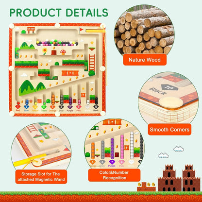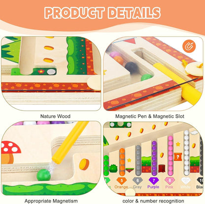 The built-in magnetic pen allows kids to move colorful beads through the maze, matching numbers and colors, encouraging focus, logical thinking, and problem-solving. Made from high-quality natural wood with smooth, rounded edges and non-toxic paint, it ensures safety and durability for long-lasting fun.